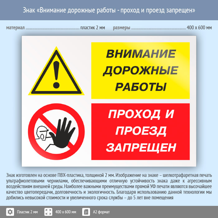 Знак «Внимание дорожные работы - проход и проезд запрещен», КЗ-14 (пластик, 600х400 мм) в Верее купить