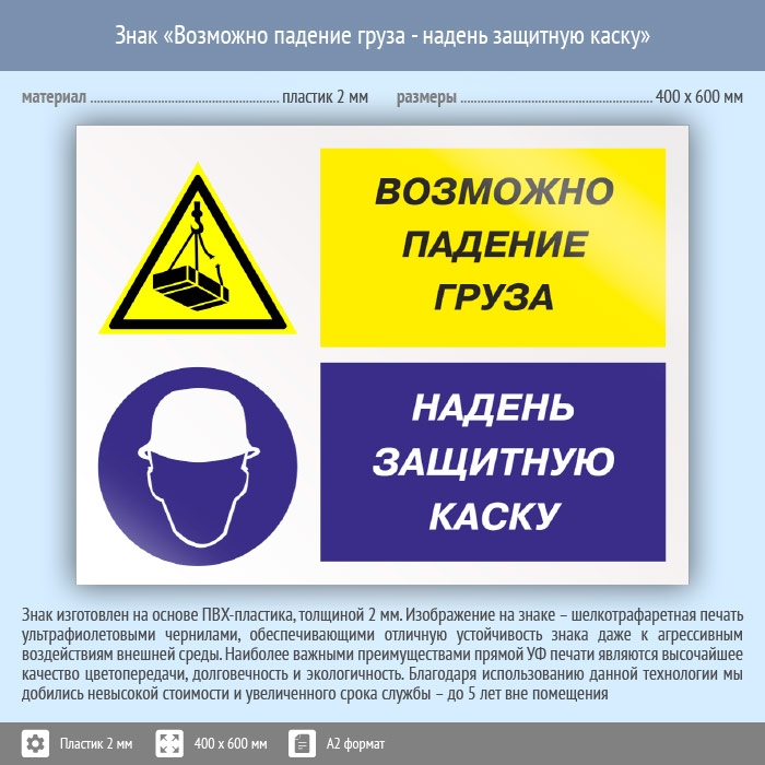 Знак «Возможно падение груза - надень защитную каску», КЗ-17 (пластик, 600х400 мм) в Верее купить