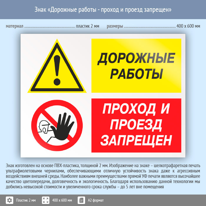 Знак «Дорожные работы - проход и проезд запрещен», КЗ-20 (пластик, 600х400 мм) в Верее купить