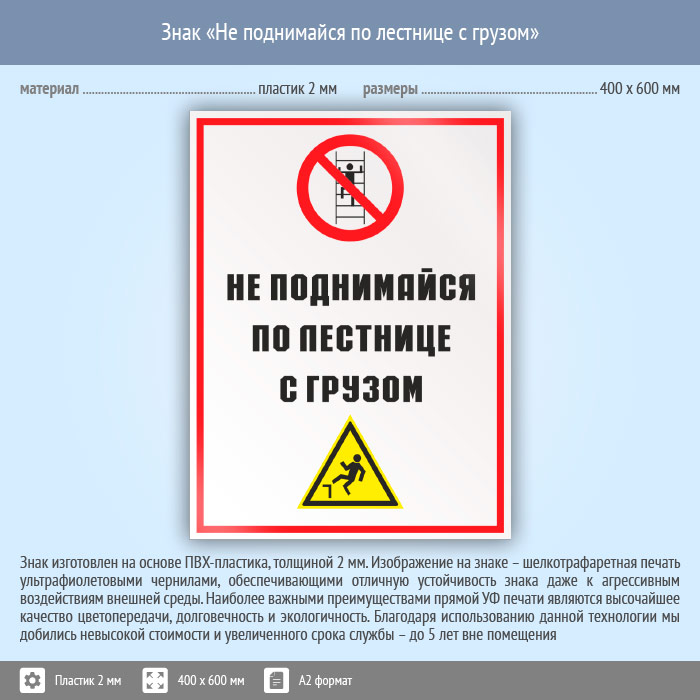 Знак «Не поднимайся по лестнице с грузом», КЗ-28 (пластик, 400х600 мм) в Верее купить