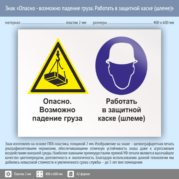 Знак «Опасно - возможно падение груза. Работать в защитной каске (шлеме)», КЗ-34 (пластик, 600х400 мм) в Верее купить