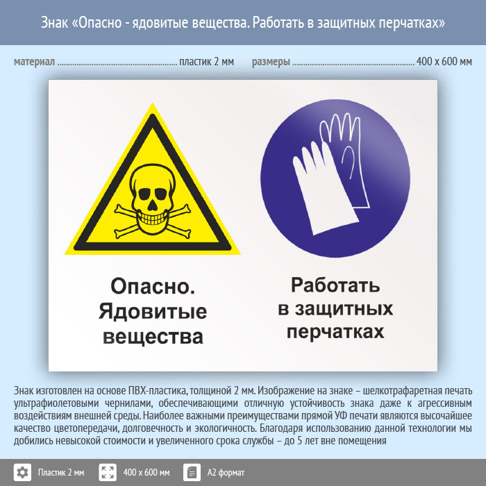 Знак «Опасно - ядовитые вещества. Работать в защитных перчатках», КЗ-43 (пластик, 600х400 мм) в Верее купить