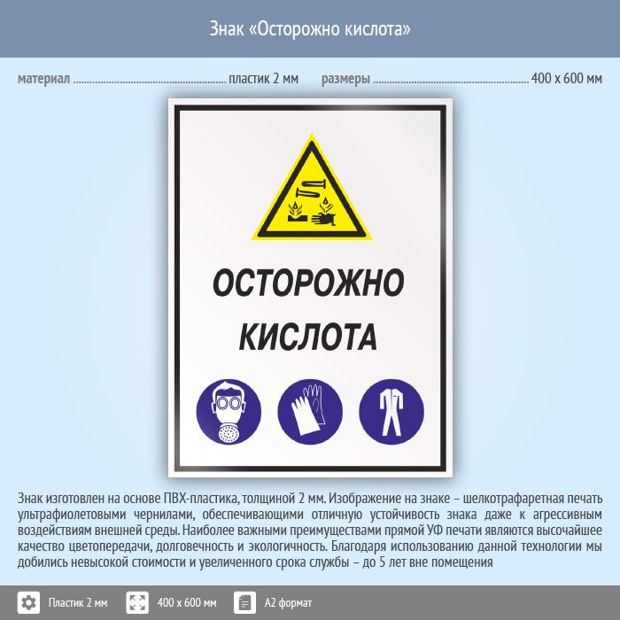 Знак «Осторожно кислота», КЗ-61 (пластик, 400х600 мм) в Верее купить