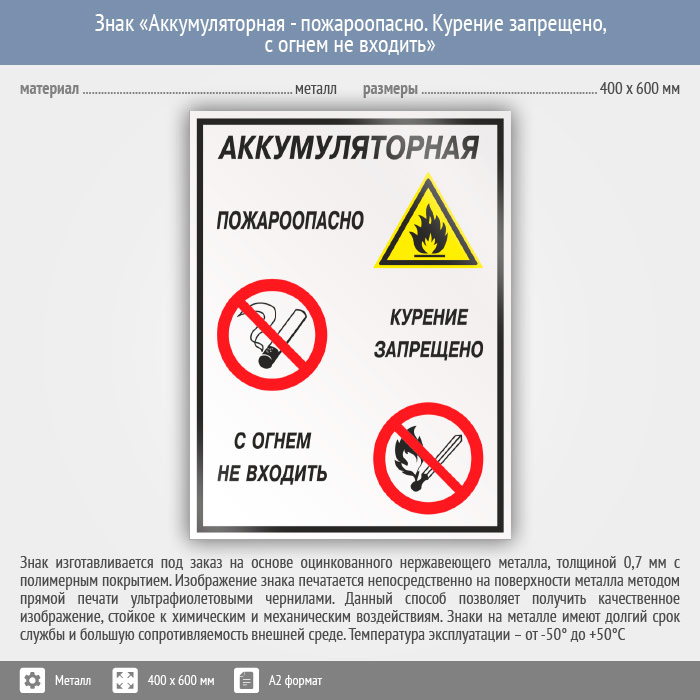 Знак «Аккумуляторная - пожароопасно. Курение запрещено, с огнем не входить», КЗ-01 (металл, 400х600 мм) в Верее купить