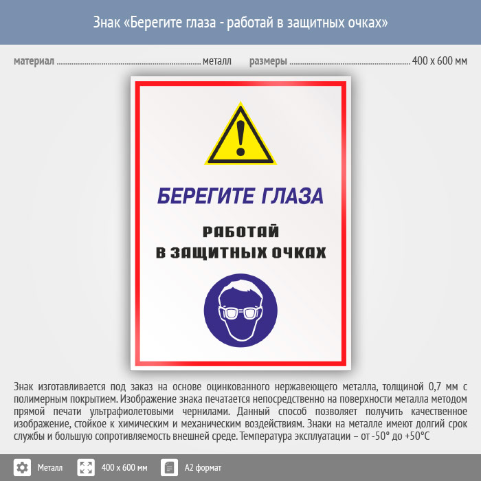 Знак «Берегите глаза - работай в защитных очках», КЗ-04 (металл, 400х600 мм) в Верее купить