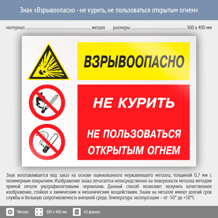 Знак «Взрывоопасно - не курить, не пользоваться открытым огнем», КЗ-05 (металл, 400х300 мм) в Верее купить