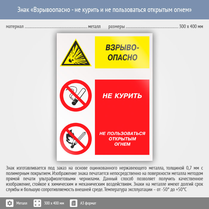 Знак «Взрывоопасно - не курить и не пользоваться открытым огнем», КЗ-08 (металл, 300х400 мм) в Верее купить