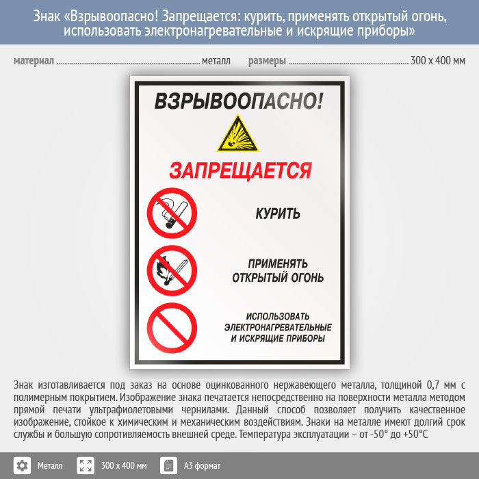 Знак «Взрывоопасно! Запрещается: курить, применять открытый огонь, использовать электронагревательные и искрящие приборы», КЗ-10 (металл, 300х400 мм) в Верее купить