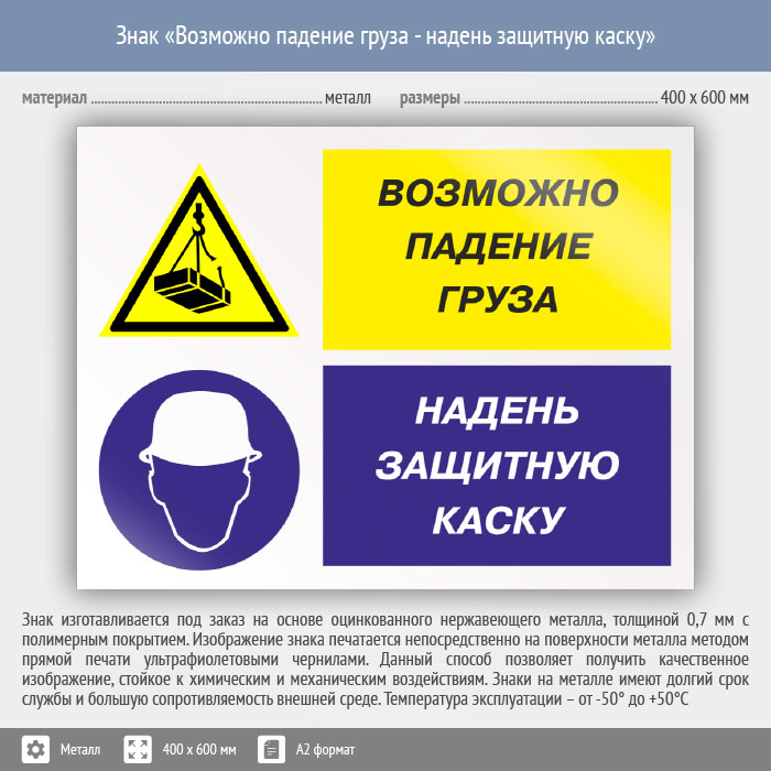 Знак «Возможно падение груза - надень защитную каску», КЗ-17 (металл, 600х400 мм) в Верее купить