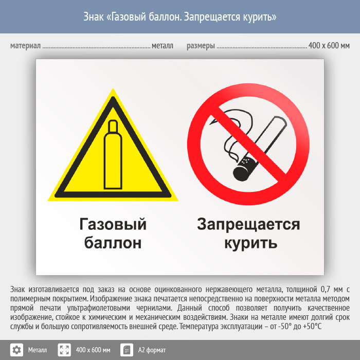 Знак «Газовый баллон. Запрещается курить», КЗ-18 (металл, 600х400 мм) в Верее купить