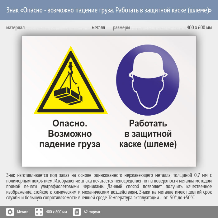 Знак «Опасно - возможно падение груза. Работать в защитной каске (шлеме)», КЗ-34 (металл, 600х400 мм) в Верее купить