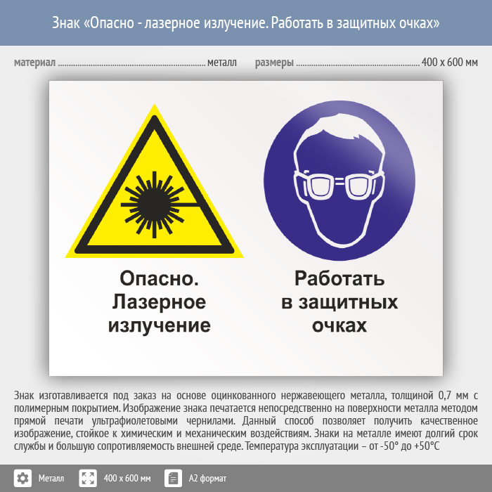 Знак «Опасно - лазерное излучение. Работать в защитных очках», КЗ-38 (металл, 600х400 мм) в Верее купить