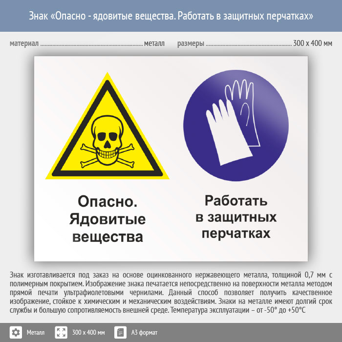 Знак «Опасно - ядовитые вещества. Работать в защитных перчатках», КЗ-43 (металл, 400х300 мм) в Верее купить