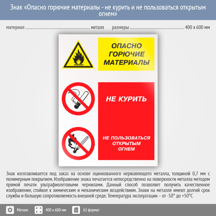 Знак «Опасно горючие материалы - не курить и не пользоваться открытым огнем», КЗ-45 (металл, 400х600 мм) в Верее купить