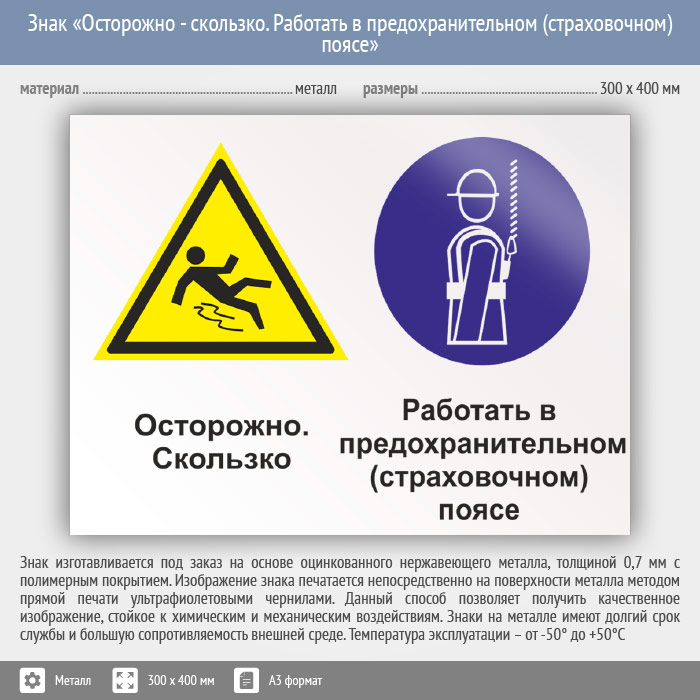 Знак «Осторожно - скользко. Работать в предохранительном (страховочном) поясе», КЗ-58 (металл, 400х300 мм) в Верее купить