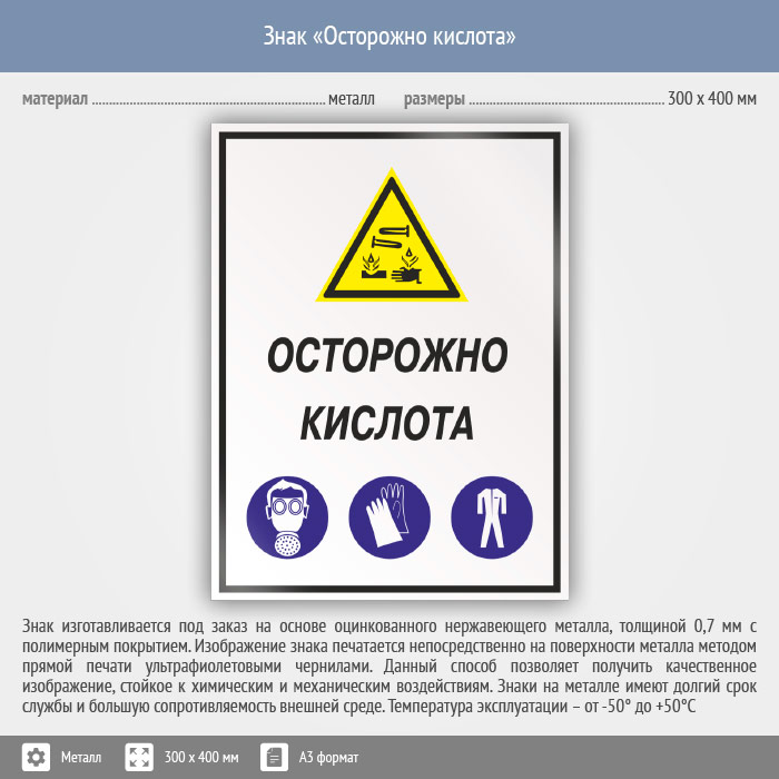 Знак «Осторожно кислота», КЗ-61 (металл, 300х400 мм) в Верее купить