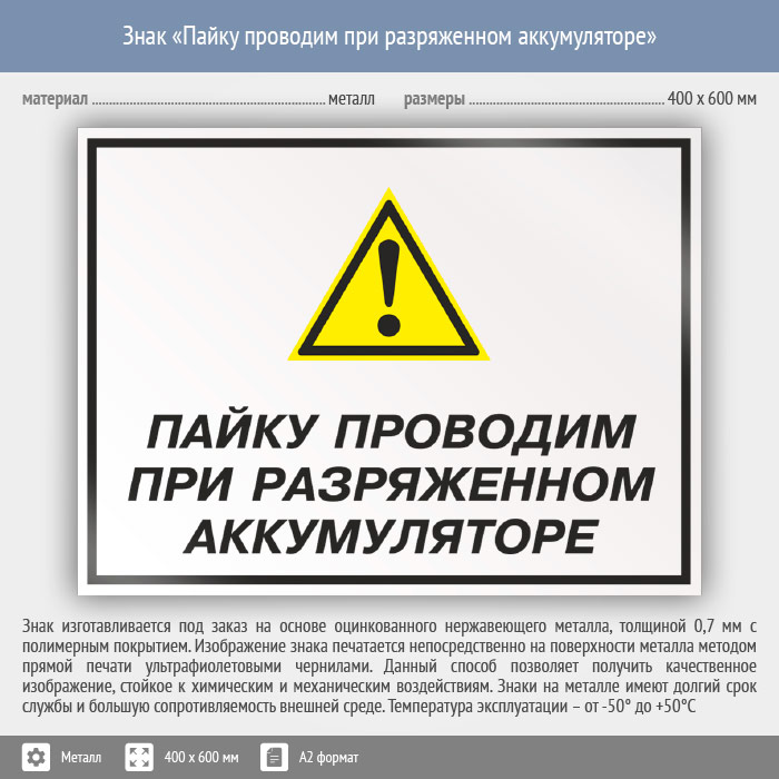 Знак «Пайку проводим при разряженном аккумуляторе», КЗ-62 (металл, 600х400 мм) в Верее купить