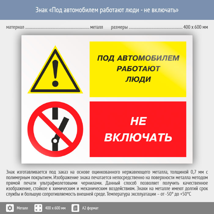 Знак «Под автомобилем работают люди - не включать», КЗ-65 (металл, 600х400 мм) в Верее купить