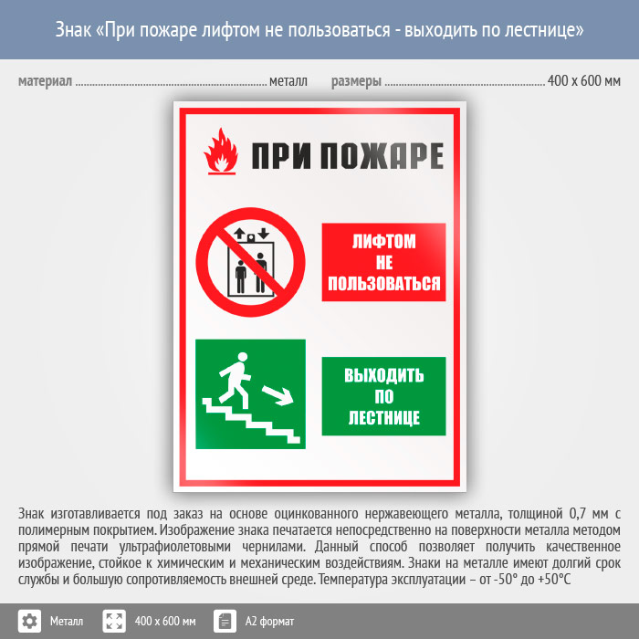 Знак «При пожаре лифтом не пользоваться - выходить по лестнице», КЗ-73 (металл, 400х600 мм) в Верее купить
