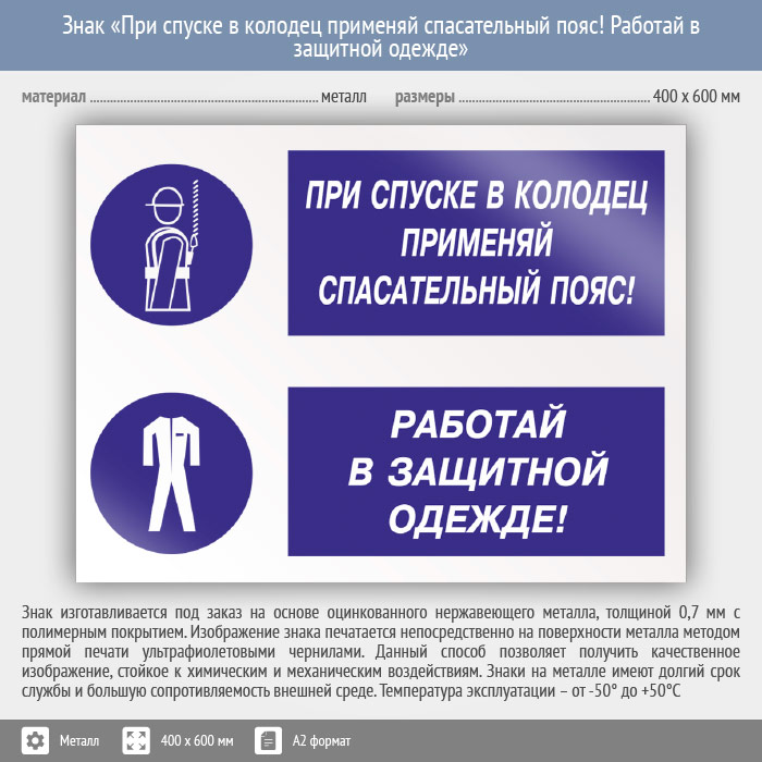 Знак «При спуске в колодец применяй спасательный пояс! Работай в защитной одежде», КЗ-76 (металл, 600х400 мм) в Верее купить