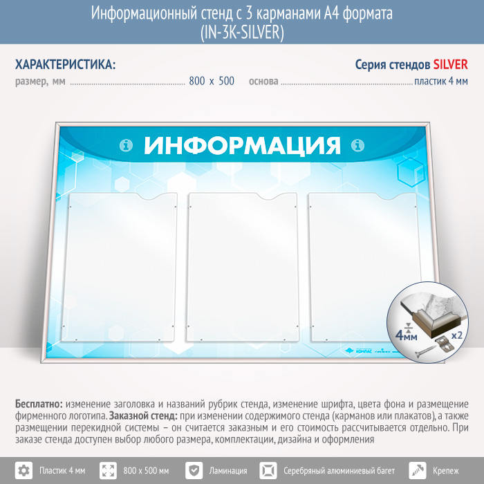 Информационный стенд с 3 карманами А4 формата (IN-3K-SILVER) в Верее купить