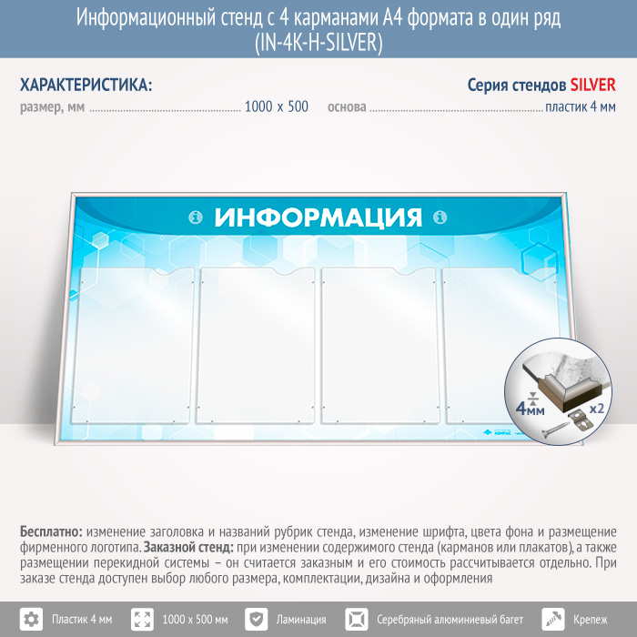 Информационный стенд с 4 карманами А4 формата в один ряд (IN-4K-H-SILVER) в Верее купить