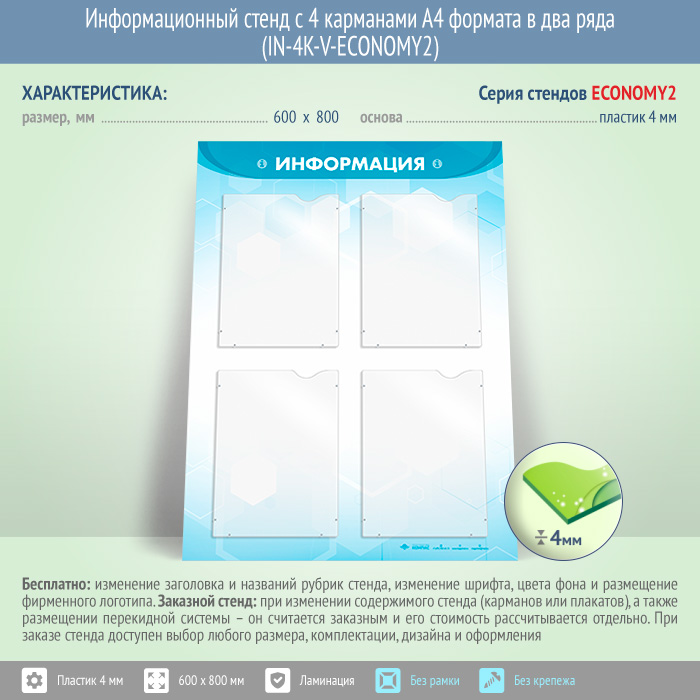 Информационный стенд с 4 карманами А4 формата в два ряда (IN-4K-V-ECONOMY2) в Верее купить