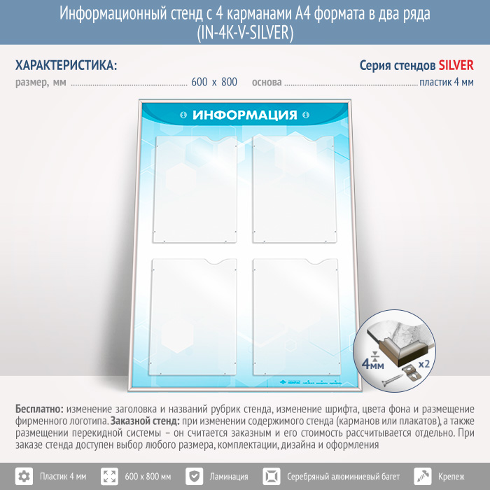 Информационный стенд с 4 карманами А4 формата в два ряда (IN-4K-V-SILVER) в Верее купить