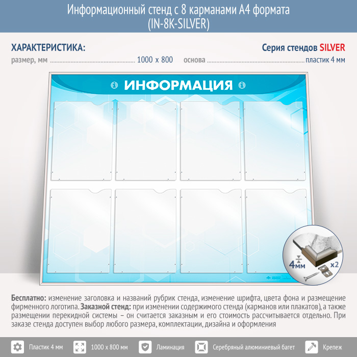 Информационный стенд с 8 карманами А4 формата (IN-8K-SILVER) в Верее купить