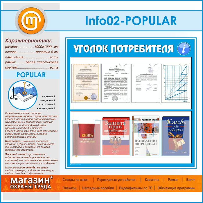 Стенд «Уголок потребителя» с 4 плоскими и 4 объемными карманами А4 формата (IN-02-POPULAR) в Верее купить