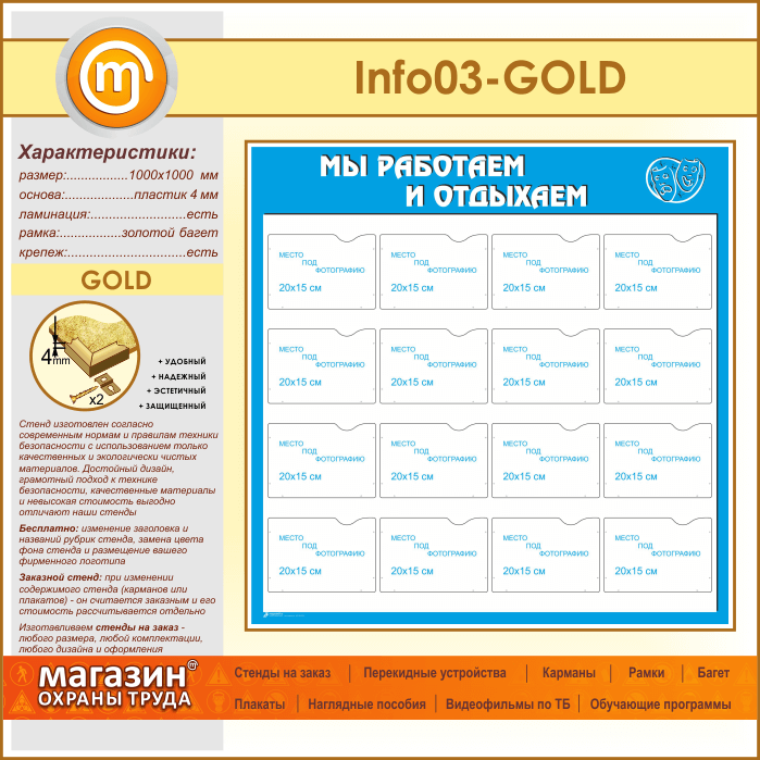 Стенд «Мы работаем и отдыхаем» с 16 карманами А5 формата (IN-03-GOLD) в Верее купить