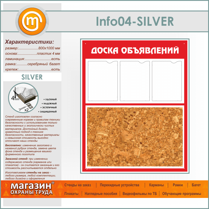 Стенд «Доска объявлений» с пробковым полотном и 3 карманами А4 формата (IN-04-SILVER) в Верее купить