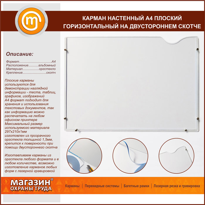 Карман настенный А4 плоский горизонтальный на двустороннем скотче в Верее купить