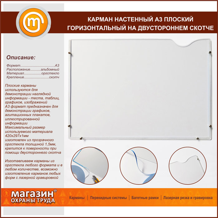 Карман настенный А3 плоский горизонтальный на двустороннем скотче в Верее купить