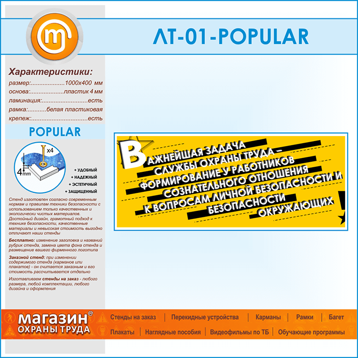 Предлагаем Вашему вниманию стенд с лозунгом «Важнейшая задача службы охраны труда – формирование у ее работников сознательного отношения к вопросам личной безопасности и безопасности окружающих»