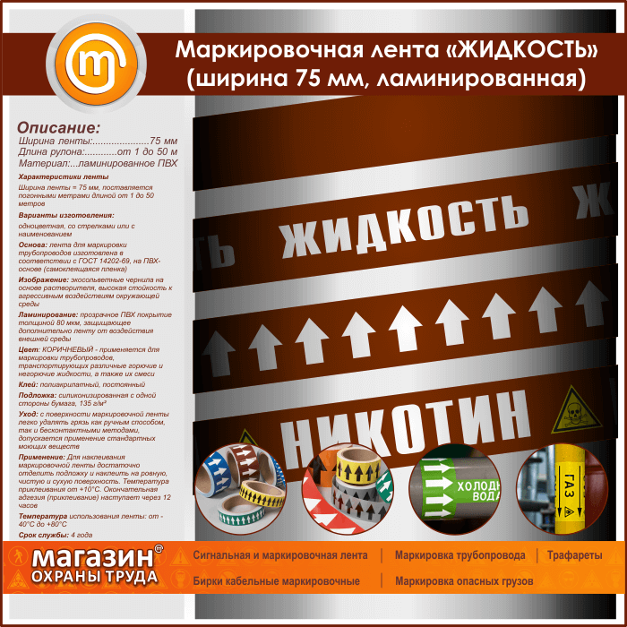 Маркировочная лента «ЖИДКОСТЬ» (ширина 75 мм, самоклеящаяся плёнка с ламинированием) в Верее купить