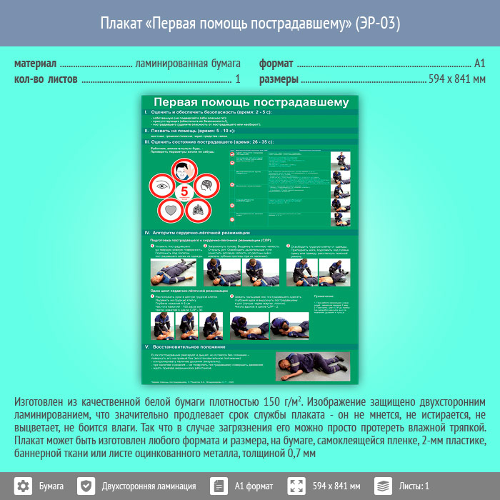 Плакат «Первая помощь пострадавшему» (ЭР-03, ламинированная бумага, А1, 1 лист) в Верее купить