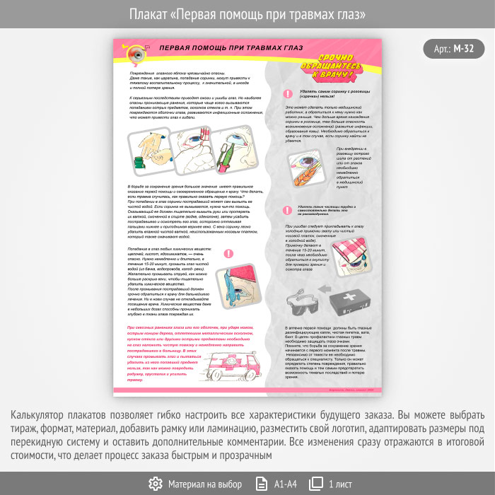 Плакат «Первая помощь при травмах глаз» (М-32, 1 лист) в Верее купить