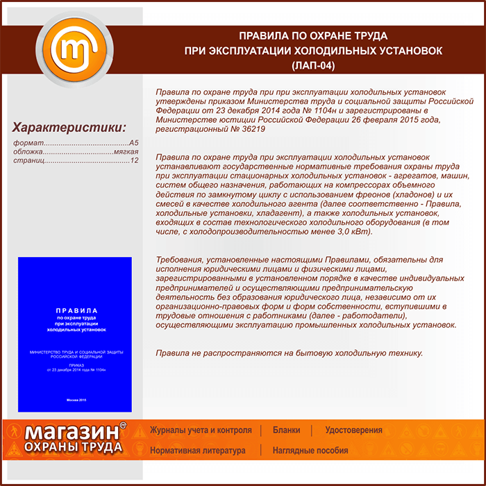 Правила по охране труда при эксплуатации холодильных установок (Приказ Минтруда РФ от 23.12.2014 №1104н) (ЛАП-04) в Верее купить