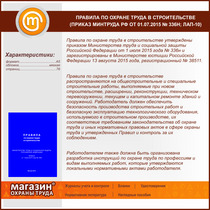 Правила по охране труда в строительстве (Приказ Минтруда РФ от 01.07.2015 № 336н) (ЛАП-10) в Верее купить