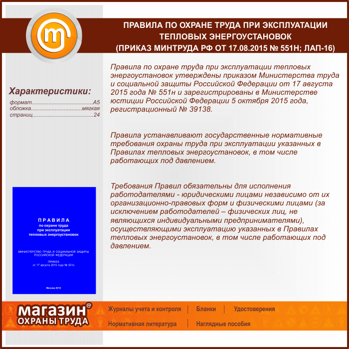 Правила по охране труда при эксплуатации тепловых энергоустановок (Приказ Минтруда РФ от 17.08.2015 № 551н) (ЛАП-16) в Верее купить