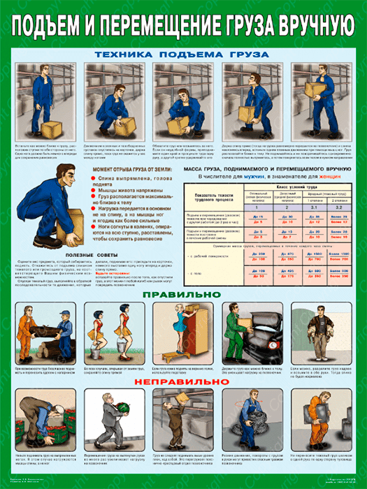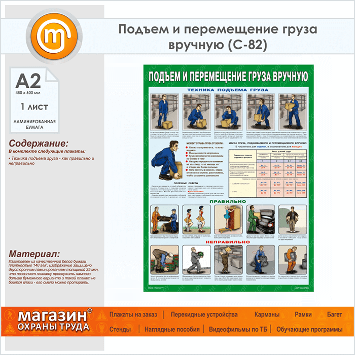 Плакат «Правила перемещения грузов вручную» (С-82, ламинированная бумага, А2, 1 лист) в Верее купить