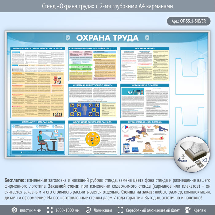 Стенд «Охрана труда» с 2-мя глубокими А4 карманами (OT-35.1-SILVER) в Верее купить