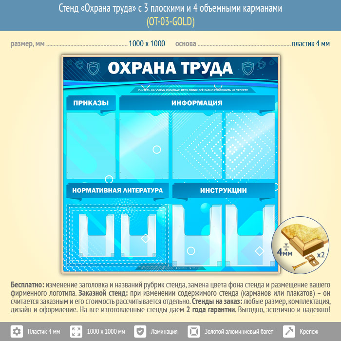 Стенд «Охрана труда» с 4 плоскими и 4 объемными карманами (OT-03-GOLD) в Верее купить