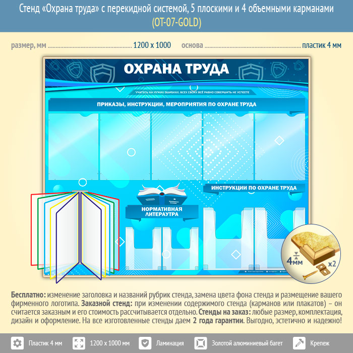 Стенд «Охрана труда» с перекидной системой, 5 плоскими и 4 объемными карманами (OT-07-GOLD) в Верее купить