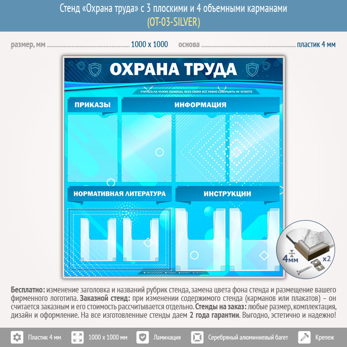 Стенд «Охрана труда» с 4 плоскими и 4 объемными карманами (OT-03-SILVER) в Верее купить