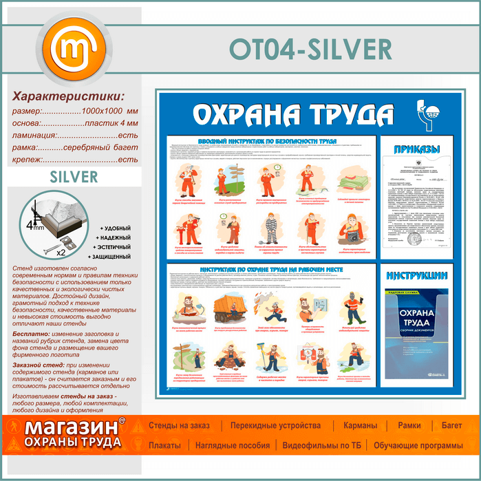 Стенд «Охрана труда» с плоским и объемным карманами (OT-04-SILVER) в Верее купить