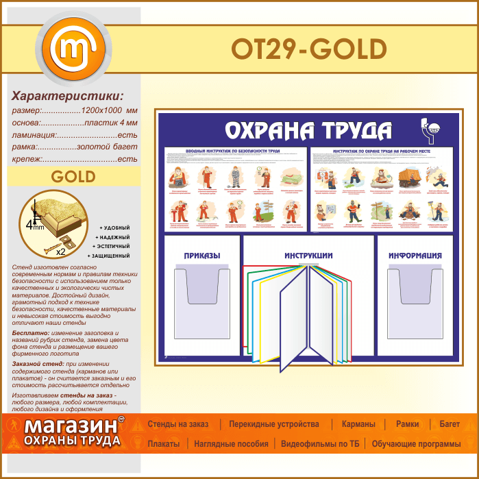 Стенд «Охрана труда» с перекидной системой и 2 объемными карманами (OT-29-GOLD) в Верее купить