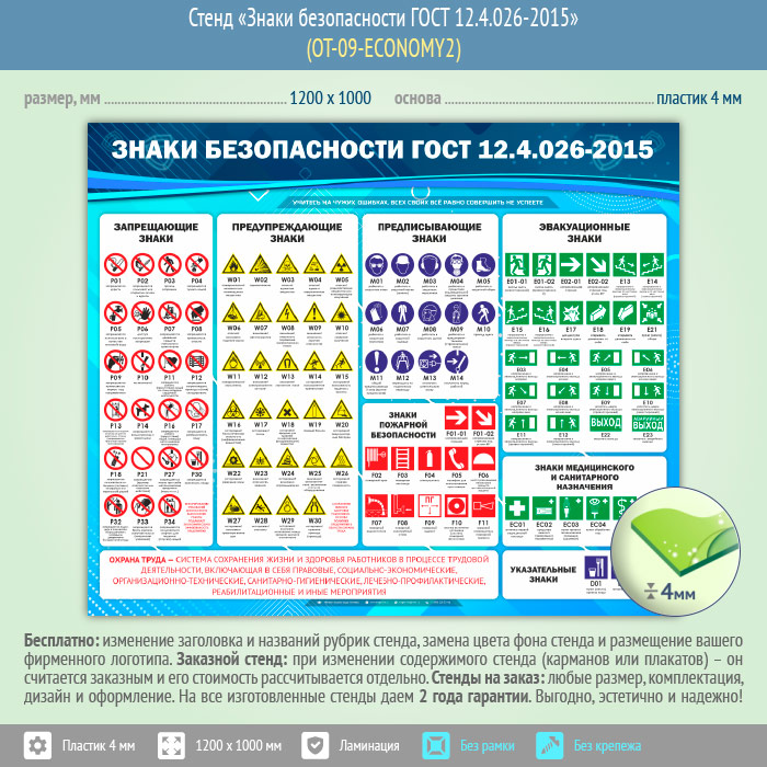 Стенд «Знаки безопасности ГОСТ 12.4.026-2015» (OT-09-ECONOMY2) в Верее купить