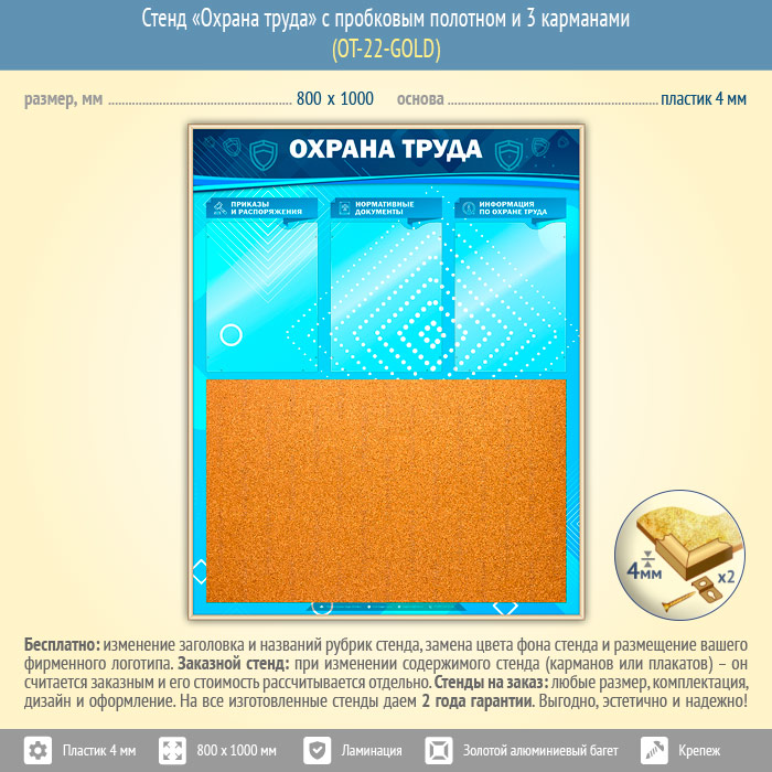 Стенд «Охрана труда» с пробковым полотном и 3 карманами (OT-22-GOLD) в Верее купить